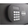 Viešbučio seifas su gerai matomu, baltu apšvietimu ekranu ir klaviatūra. „