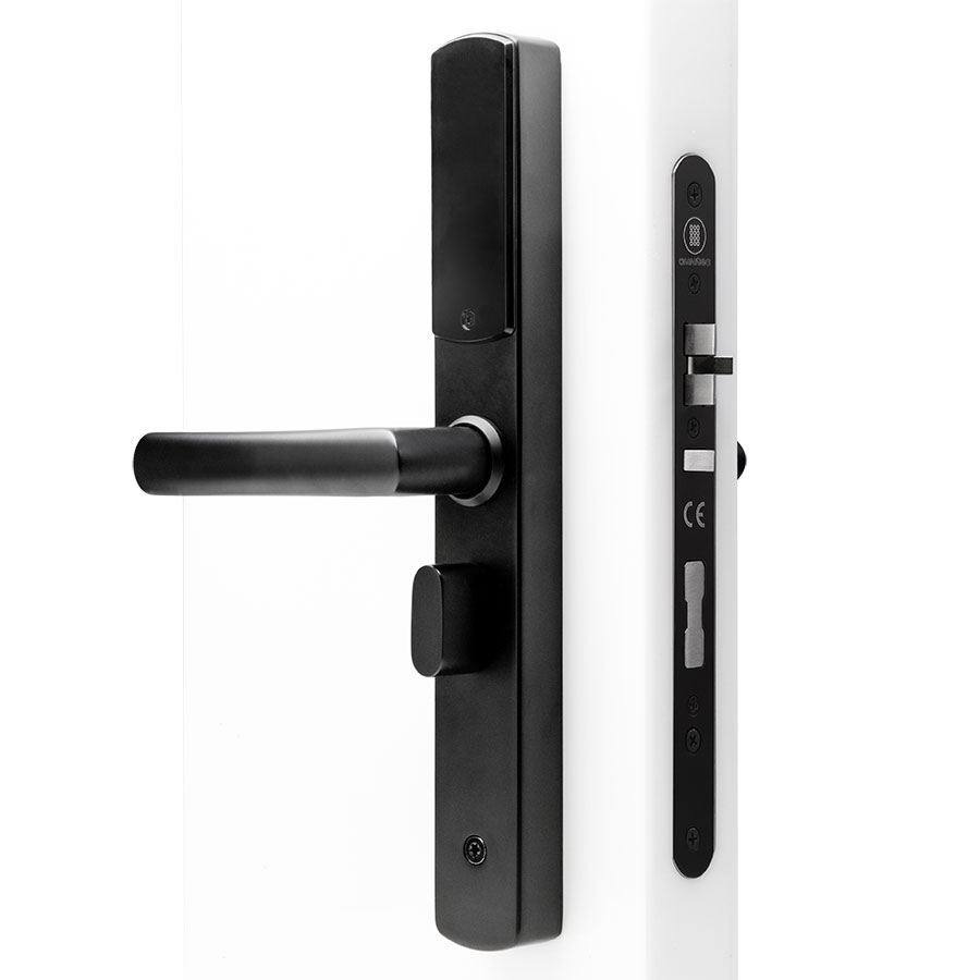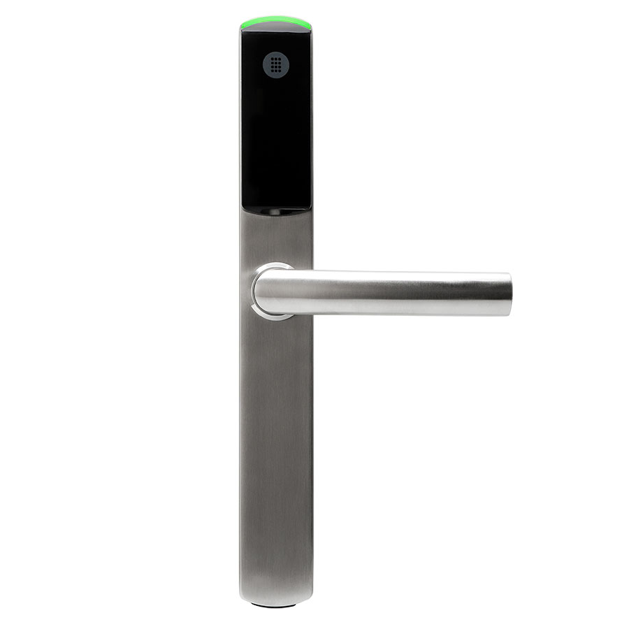 Elektroninė spyna, kuri prisitaiko prie esamų spynų, net ir siauro profilio aliuminio duryse.
