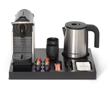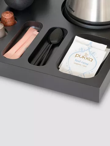 „Xanthic“ kavos ir arbatos padėkle yra integruota vieta virdulio pagrindui, taip pat 3 įdubimai kavos pakeliams ir šaukšteliams bei 6 įdubimai „Nespresso®“ kapsulėms, todėl jūsų svečiai galės lengvai pasigaminti tobulą puodelį kavos ar arbatos.