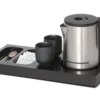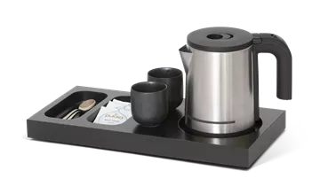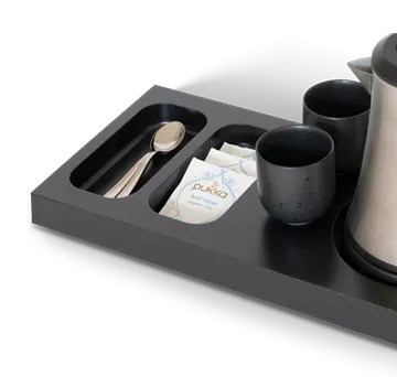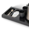 Pristatome mažą juodą „Xanthic“ pasveikinimo padėklą.Kompaktiškas ir funkcionalus bet kurio viešbučio kambario papildymas.Su integruota vieta virdulio pagrindui, 2 įdubimais maišeliams ir šaukšteliams, jūsų svečiai galės lengvai pasigaminti arbatos ar kavos.